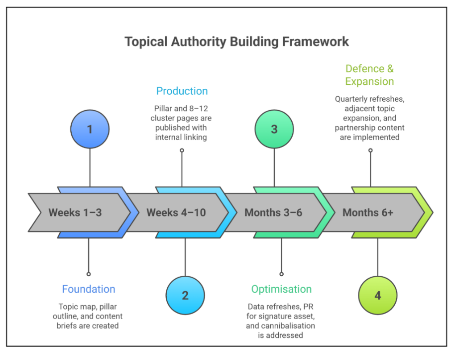 - Stage 4 – Defence & Expansion (months 6+): Quarterly refreshes, adjacent topic expansion, partnership content.
