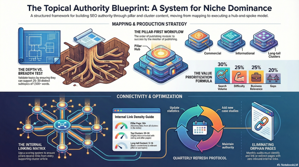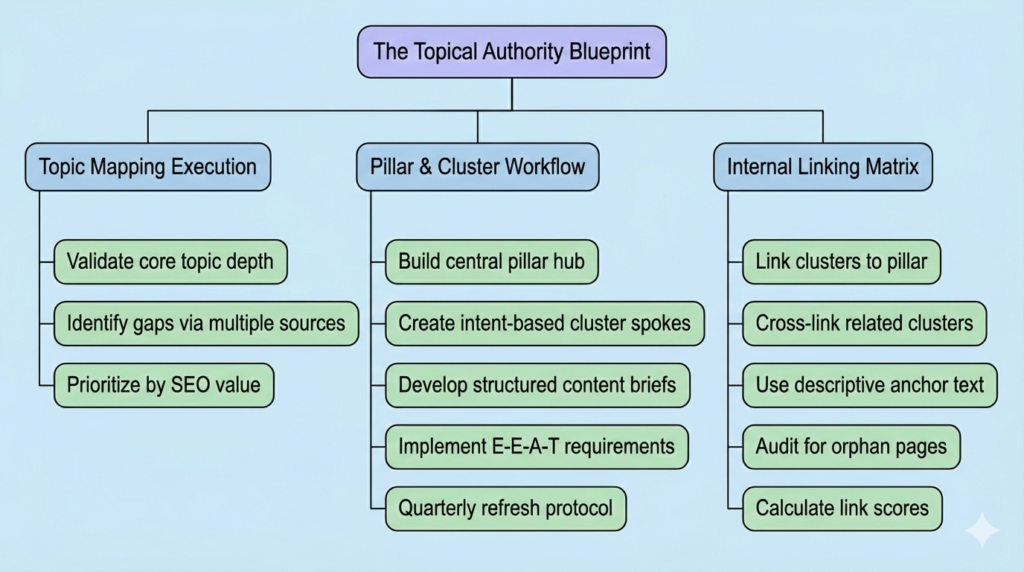 You’ve read the theory in our main topical authority guide. If you follow this framework, you’ll create a stronger hub-spoke architecture that actually earns authority.