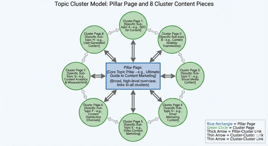 - Interlink everything (pillar ↔ clusters ↔ clusters).