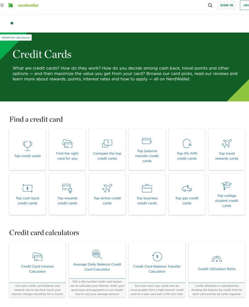 Their structure follows a classic hub-and-spoke model: large pillar pages for areas like credit cards, banking, loans, and investing, supported by hundreds of intent-driven cluster pages.