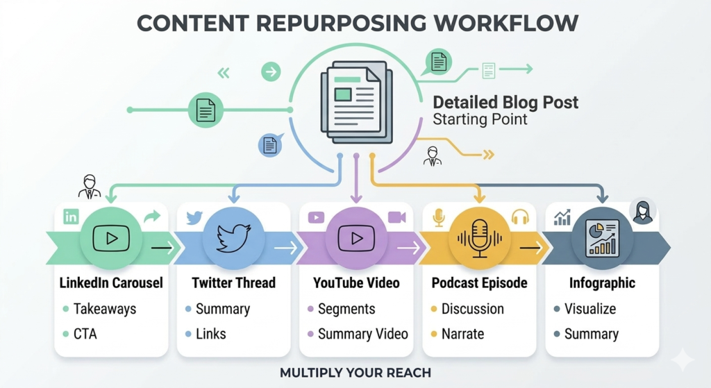 Repurposing doesn’t just multiply reach. It creates multiple entry points for the same content. Someone who ignores a blog post might watch the video, share the infographic, or read the LinkedIn carousel and then visit your site.