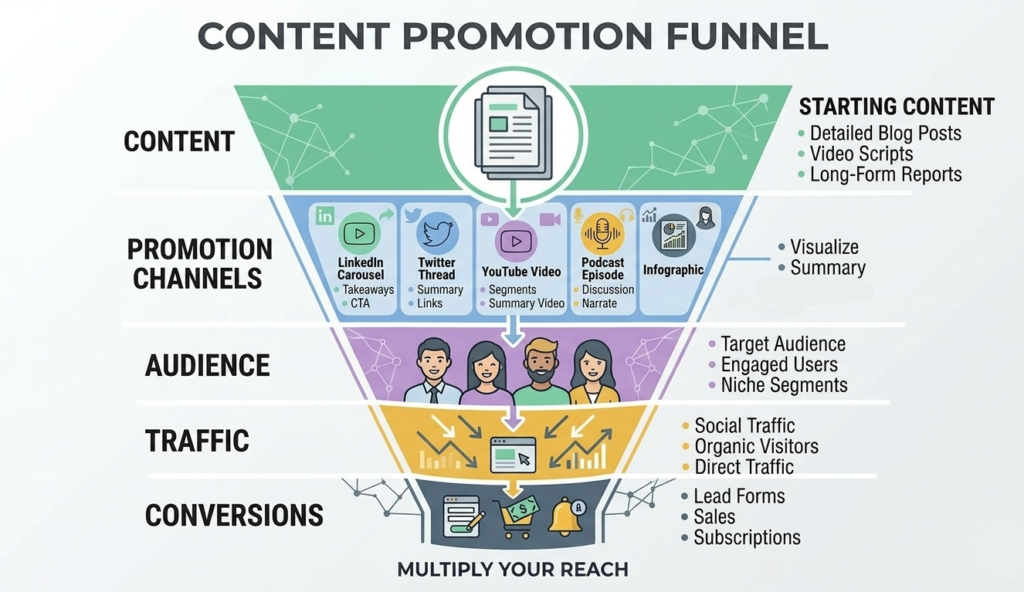 Pro Tip: Build a simple content promotion calendar. Map out every piece of content and plan 3–5 different social posts for each, varying format, angle, and platform. This alone will multiply your content’s reach without any additional writing.